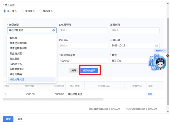 根據(jù)實際情況選擇差額扣除憑證類型,并錄入相關(guān)憑證信息(如勞務(wù)派遣服務(wù)中代用工單位支付給勞務(wù)派遣員工的工資、福利和為其辦理社會保險及住房公積金),包括憑證合計金額和本次扣除金額,點擊【保存并繼續(xù)】。