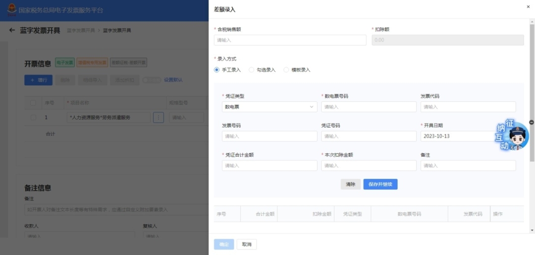 3.根據(jù)實際情況錄入扣除信息,支持錄入多份差額扣除憑證。錄入完成后,完成所有扣除項錄入后,點擊【確定】按鈕。
