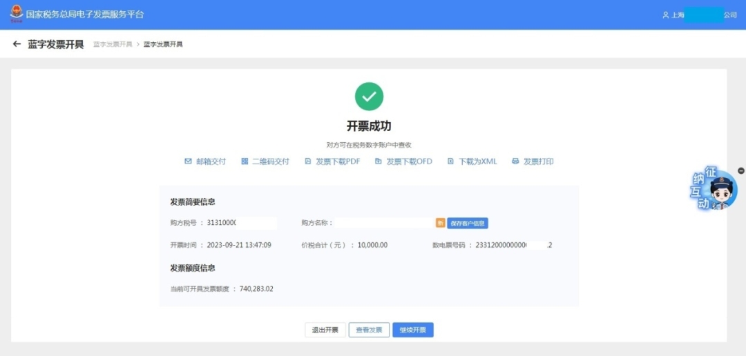 1.核對開票信息無誤后,點擊【發(fā)票開具】按鈕,提示開具成功,即完成發(fā)票開具。