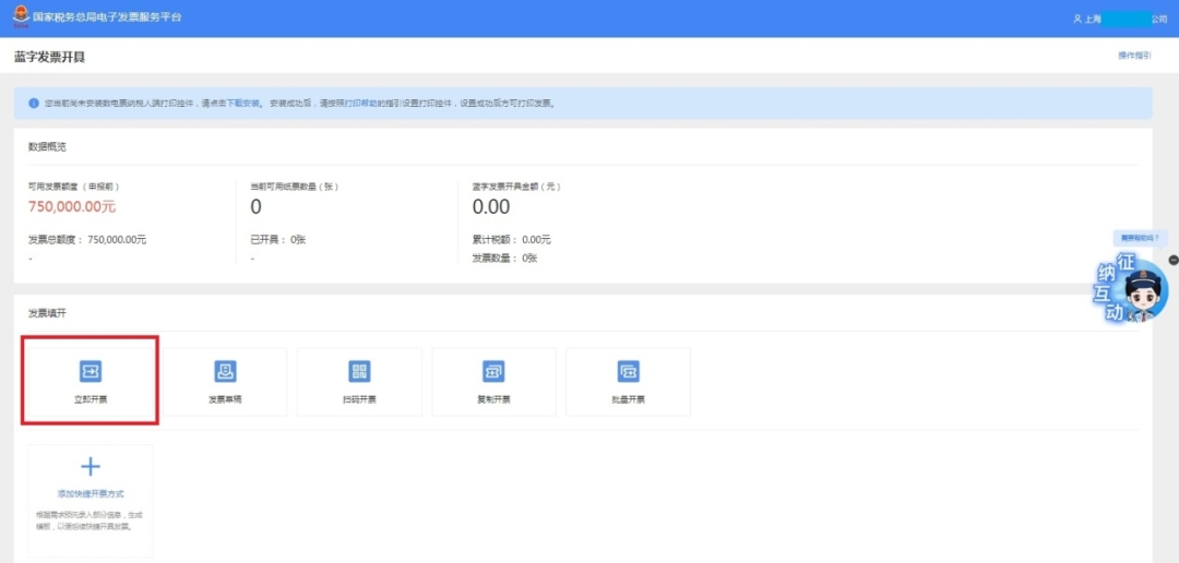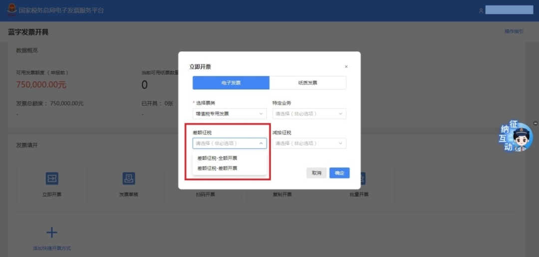 2.點擊【立即開票】,選擇【差額征稅-差額開票】進(jìn)入開票界面。