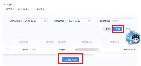 選擇開票日期起止時間,點擊【查詢】,系統(tǒng)顯示該時間段取得的發(fā)票信息,勾選差額扣除內(nèi)容對應(yīng)的發(fā)票,錄入扣除額后,點擊【提交勾選】。
