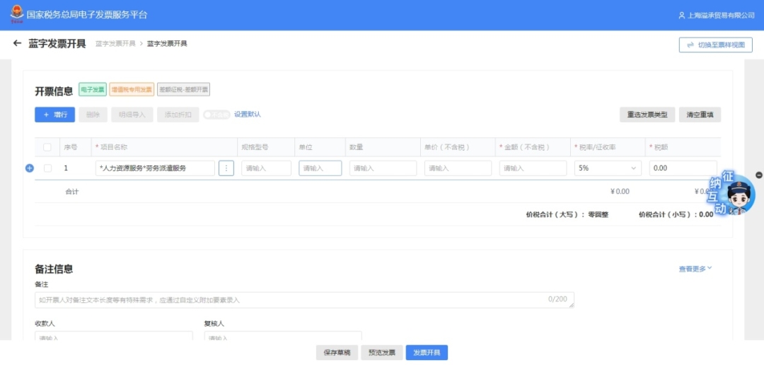 1.“差額征稅-全額開票”操作流程:點擊【立即開票】,選擇發(fā)票票種,“差額征稅”下拉選擇“差額征稅——全額開票”,點擊【確定】。具體開票操作與一般藍(lán)字發(fā)票開具操作相同,發(fā)票左上角顯示“差額征稅—全額開票”標(biāo)簽。不需要填寫扣除項,直接錄入全部金額開具金額即可。某些特定業(yè)務(wù)使用差額開票只能開具普通發(fā)票,比如勞務(wù)派遣服務(wù)、人力資源外包服務(wù)等。