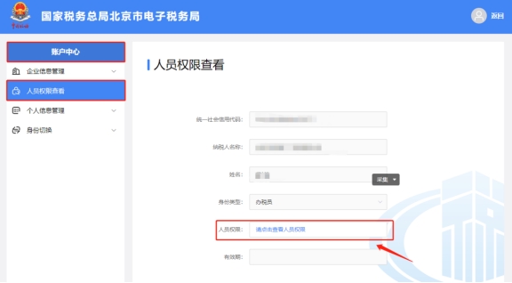 四、賬戶中心—人員權(quán)限管理—現(xiàn)有辦稅人員,模塊查看人員關(guān)聯(lián)信息。