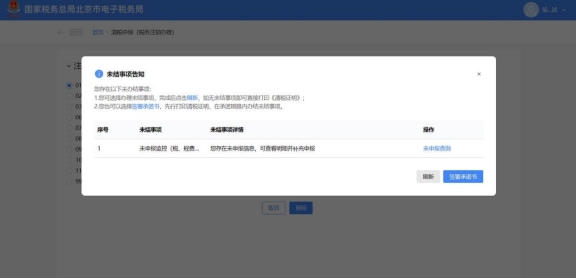 ?、倌蛇x擇辦理未結(jié)事項,完成后點擊刷新,如無未結(jié)事項即可直接打印《清稅證明》; ②您也可以選擇簽署承諾書,先行打印清稅證明,在承諾期限內(nèi)辦結(jié)未結(jié)事項。納稅人采用承諾注銷打印清稅證明后,未辦結(jié)事項可以通過登錄電子稅務(wù)局進(jìn)入該功能“未辦結(jié)事項告知”辦理。