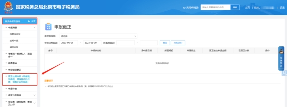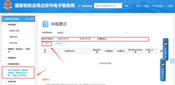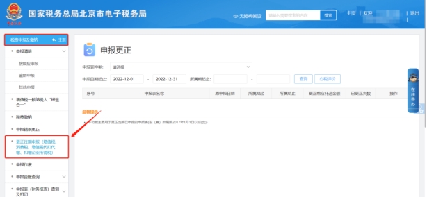 二、稅費(fèi)申報(bào)及繳納,更正往期申報(bào)(增值稅、消費(fèi)稅、增值稅代扣代繳、扣繳企業(yè)所得稅)模塊,根據(jù)查詢條件找到報(bào)表后點(diǎn)擊右側(cè)的“更正申報(bào)”按鈕進(jìn)入表單完成修改及申報(bào)。