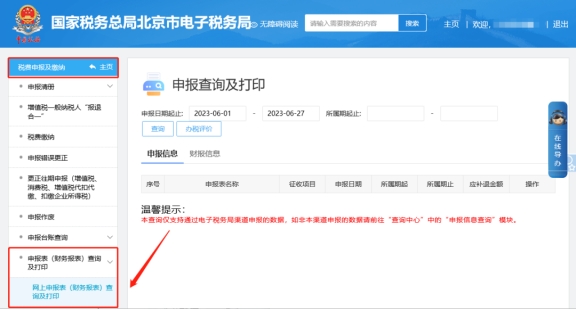 二、稅費(fèi)申報(bào)及繳納—申報(bào)表(財(cái)務(wù)報(bào)表)查詢及打印—網(wǎng)上申報(bào)表(財(cái)務(wù)報(bào)表)查詢及打印模塊查詢更新后的報(bào)表信息即可。