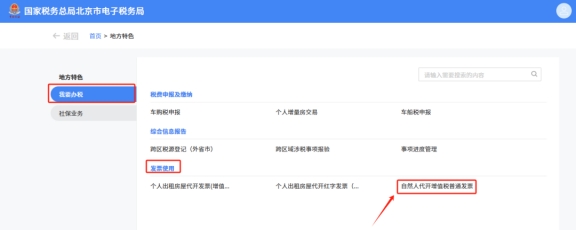 使用自然人身份登錄新電子稅局,是否可以代開增值稅普通發(fā)票?  答、可以,路徑為:【地方特色】—【我要辦稅】—【發(fā)票使用】—【自然人代開增值稅普通發(fā)票】?! D示指引如下  一、地方特色?! 《?、我要辦稅—發(fā)票使用—自然人代開增值稅普通發(fā)票。..