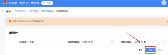 二、預(yù)繳稅款查詢進(jìn)入功能頁面,輸入查詢條件點(diǎn)擊【查詢】。
