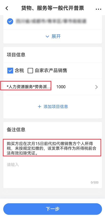自然人代開(kāi)貨物、服務(wù)等一般發(fā)票,若項(xiàng)目信息屬于服務(wù)類的(個(gè)稅勞務(wù)報(bào)酬),備注信息下方展示“購(gòu)買(mǎi)方應(yīng)在次月15日前代扣代繳銷(xiāo)售方個(gè)人所得稅,未按規(guī)定扣繳的,該發(fā)票不得作為所得稅前合法有效扣除憑證。”