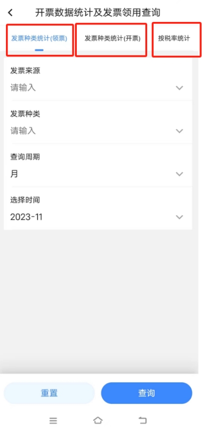 打開“開票數(shù)據(jù)統(tǒng)計(jì)及發(fā)票領(lǐng)用查詢”界面后,查詢“發(fā)票種類(領(lǐng)票)”、“發(fā)票種類統(tǒng)計(jì)(開票)”、“按稅率/征收率”統(tǒng)計(jì)數(shù)據(jù)可點(diǎn)擊界面上方的名稱切換查詢界面。