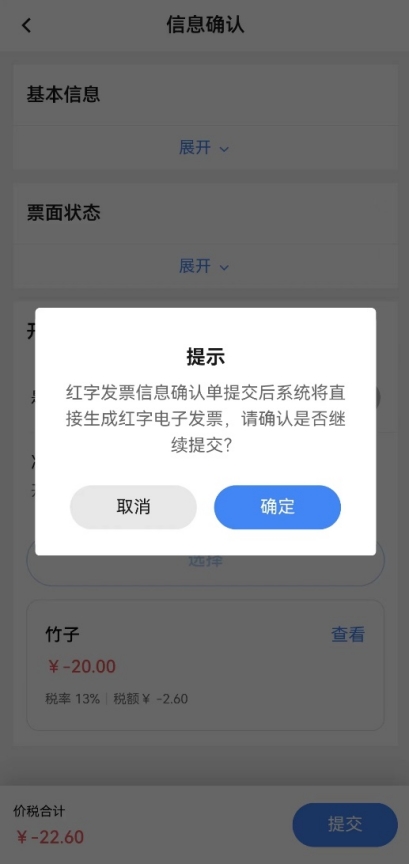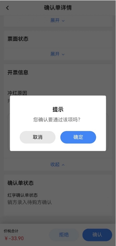 如藍(lán)字發(fā)票為web端開具的紙質(zhì)發(fā)票,在移動端發(fā)起確認(rèn)單或在web端選擇“與原藍(lán)票一致票種的紙質(zhì)發(fā)票”發(fā)起確認(rèn)單,在移動端確認(rèn)時,點(diǎn)擊【確認(rèn)】后,彈出“您確認(rèn)要通過該項(xiàng)嗎?”的提示。點(diǎn)擊【確定】后,提示確認(rèn)成功,還需在web端的【紅字發(fā)票業(yè)務(wù)】-【紅字發(fā)票開具】中點(diǎn)擊【去開票】才能成功開具紅字發(fā)票。