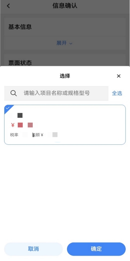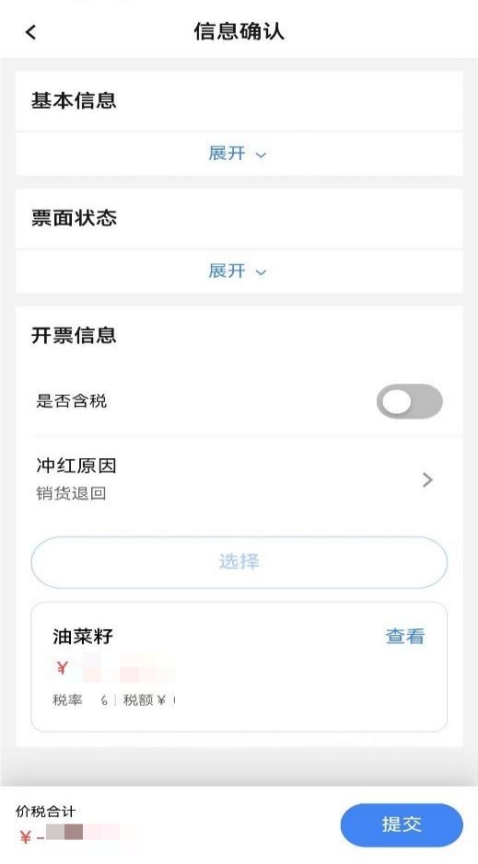 納稅人點(diǎn)擊要紅沖的藍(lán)字發(fā)票,進(jìn)入“信息確認(rèn)”頁面,此頁面從上至下可分為基本信息、票面狀態(tài)、開票信息??赏ㄟ^點(diǎn)擊【展開】下拉按鈕查看購銷雙方基本信息和藍(lán)字發(fā)票的一些票面信息和藍(lán)字發(fā)票狀態(tài)等信息。開票信息中可通過點(diǎn)擊【紅沖原因】選擇具體的紅沖原因,下方顯示可紅沖的項(xiàng)目信息。點(diǎn)擊【查看】按鈕可顯示可紅沖項(xiàng)目的規(guī)格型號、數(shù)量、金額等具體信息。