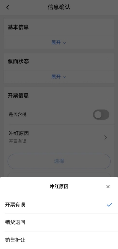 納稅人開具藍(lán)字發(fā)票后,發(fā)生銷貨退回(包括全部退回和部分退回)、開票有誤、服務(wù)中止(服包括全部中止和部分中止)、銷售折讓等情形,按規(guī)定開具紅字發(fā)票。移動端僅支持開具紅字電子發(fā)票,且不支持特定業(yè)務(wù)發(fā)票的紅沖。