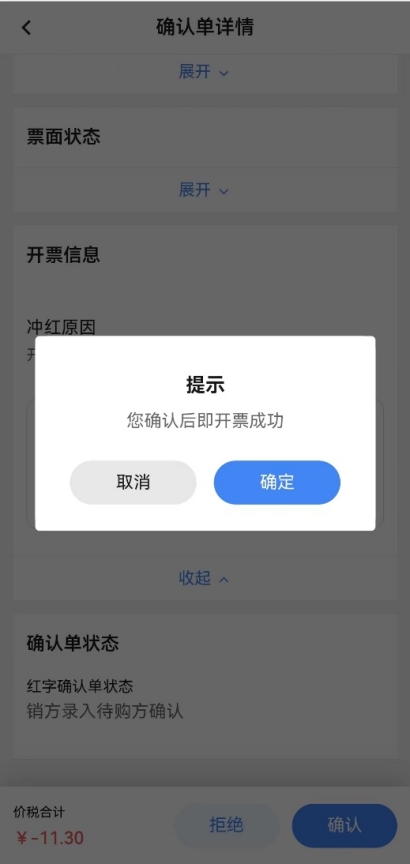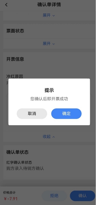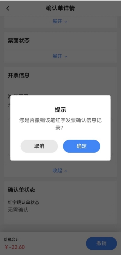 選擇需要處理的紅字信息確認(rèn)單,點(diǎn)擊后進(jìn)入“確認(rèn)單詳情”頁面。無需確認(rèn)的情況下銷方在紅字發(fā)票未開具前,點(diǎn)擊【撤銷】彈出撤銷提示,點(diǎn)擊【確定】成功撤銷此紅字信息確認(rèn)單。需要雙方確認(rèn)的場景發(fā)起方在對方未確認(rèn)前,點(diǎn)擊【拒絕】彈出撤銷提示,點(diǎn)擊【確定】成功撤銷此紅字信息確認(rèn)單。