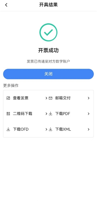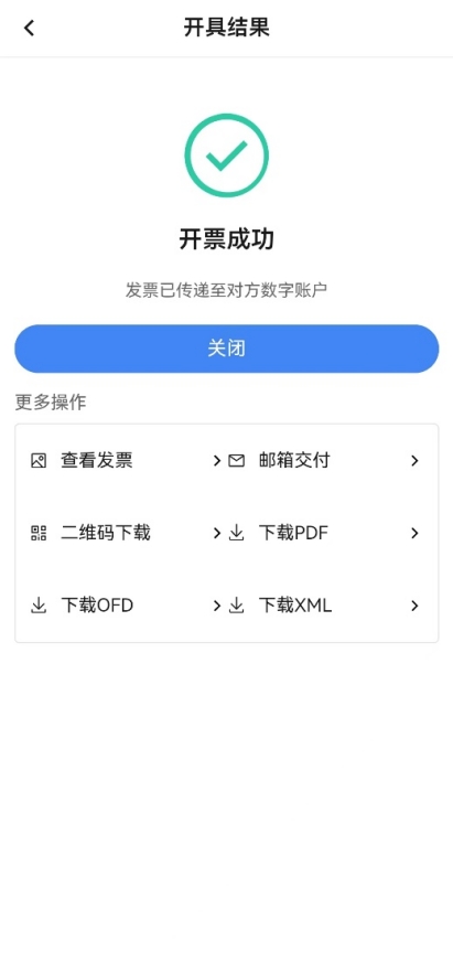 打開的確認(rèn)單狀態(tài)為“購方錄入待銷方確認(rèn)”時,點(diǎn)擊【確認(rèn)】,彈出確認(rèn)即開票提示,點(diǎn)擊【確定】,紅字發(fā)票開具成功,跳轉(zhuǎn)到“開具結(jié)果”頁面,此頁面可查看開具的紅字發(fā)票,同時展示各個發(fā)票交付渠道,可按各渠道按鈕點(diǎn)擊后進(jìn)行相應(yīng)交付。