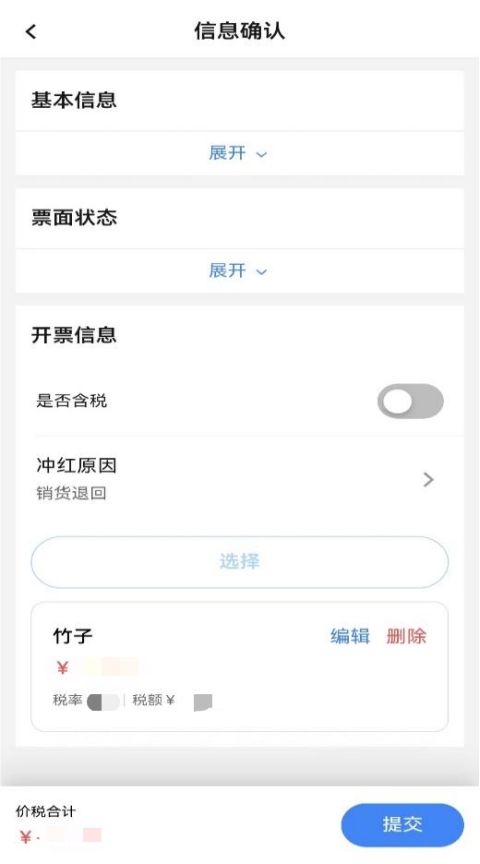 納稅人選擇具體的紅沖原因,系統(tǒng)可根據(jù)選擇的紅沖原因以及發(fā)票標(biāo)簽控制允許納稅人修改項(xiàng)目信息詳情頁面數(shù)據(jù)。