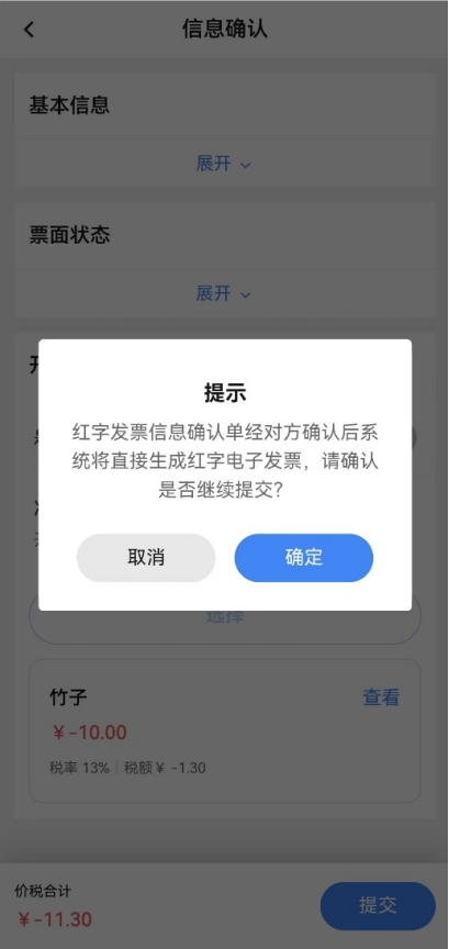 點(diǎn)擊【提交】按鈕,如藍(lán)字發(fā)票購買方未用票,系統(tǒng)彈出“紅字發(fā)票信息確認(rèn)單提交后系統(tǒng)將直接生成紅字電子發(fā)票,請確認(rèn)是否繼續(xù)提交”的提示。點(diǎn)擊【確認(rèn)】,紅字發(fā)票開具成功,系統(tǒng)展示“開具結(jié)果”頁面,此頁面可查看開具的紅字發(fā)票,同時展示各個發(fā)票交付渠道,可按各渠道按鈕點(diǎn)擊后進(jìn)行相應(yīng)交付;如藍(lán)字發(fā)票購買方已用票,系統(tǒng)彈出“紅字發(fā)票信息確認(rèn)單經(jīng)對方確認(rèn)后系統(tǒng)將直接生成紅字電子發(fā)票,請確認(rèn)是否繼續(xù)提交”提示,點(diǎn)擊【確認(rèn)】,系統(tǒng)提示“提交成功”,同時自動跳轉(zhuǎn)到紅字發(fā)票確認(rèn)信息錄入的查詢結(jié)果頁面。