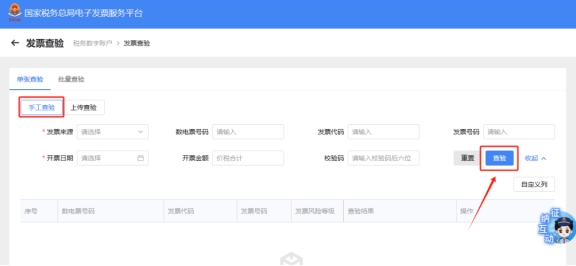 (1)使用電子發(fā)票服務(wù)平臺(tái)。納稅人可在電子發(fā)票服務(wù)平臺(tái)依次選擇【稅務(wù)數(shù)字賬戶】—【發(fā)票查驗(yàn)】進(jìn)入查詢界面,選擇“手工查驗(yàn)”并按實(shí)際情況填寫相應(yīng)項(xiàng)目,點(diǎn)擊“查驗(yàn)”,系統(tǒng)會(huì)顯示對(duì)應(yīng)發(fā)票查驗(yàn)結(jié)果。