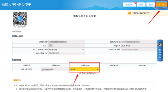 三、納稅人所處街鄉(xiāng)變更頁面,進(jìn)入后選擇變更信息里的變更后內(nèi)容(標(biāo)黃),填寫完成后檢查并上傳需要的附送資料,右上角的附送資料里顯示為“必報(bào)”的需要上傳,完成后保存點(diǎn)擊下一步提交即可。