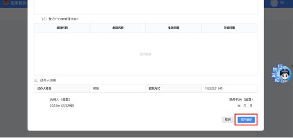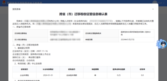 系統(tǒng)彈出預(yù)覽表單界面,展示“跨省(市)遷移稅收征管信息確認(rèn)表”,點(diǎn)擊【我已確定】。