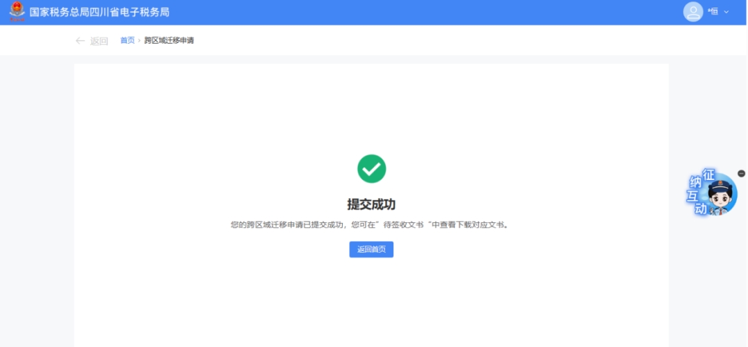 (2)當(dāng)自動(dòng)審核關(guān)閉時(shí),系統(tǒng)提示“您的跨區(qū)域遷移申請(qǐng)已提交成功,請(qǐng)耐心等待稅務(wù)機(jī)關(guān)的處理結(jié)果”。