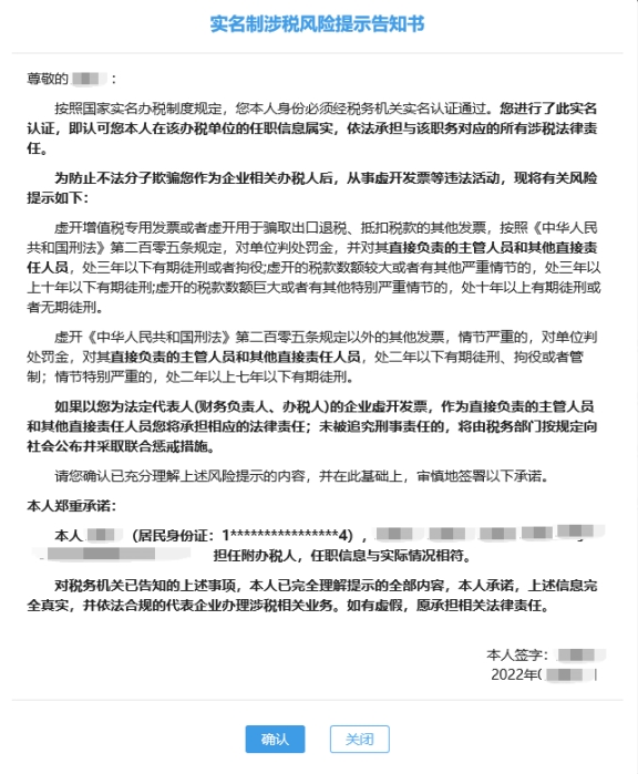 七、實名制涉稅風(fēng)險提示告知書頁面。