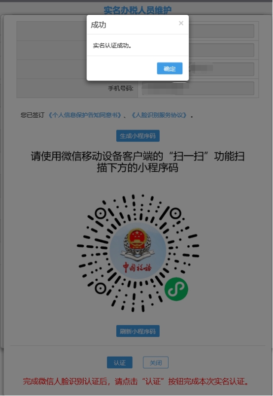 十、人臉識別頁面(掃描二維碼)完成后點擊“認(rèn)證”。