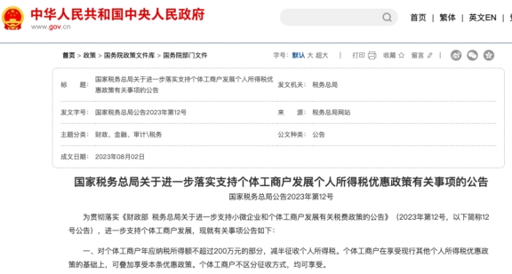《國(guó)家稅務(wù)總局關(guān)于進(jìn)一步落實(shí)支持個(gè)體工商戶(hù)發(fā)展個(gè)人所得稅優(yōu)惠政策有關(guān)事項(xiàng)的公告》(國(guó)家稅務(wù)總局公告2023年第12號(hào))