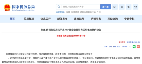 《財(cái)政部 稅務(wù)總局關(guān)于金融機(jī)構(gòu)小微企業(yè)貸款利息收入免征增值稅政策的公告》(財(cái)政部 稅務(wù)總局公告2023年第16號(hào))