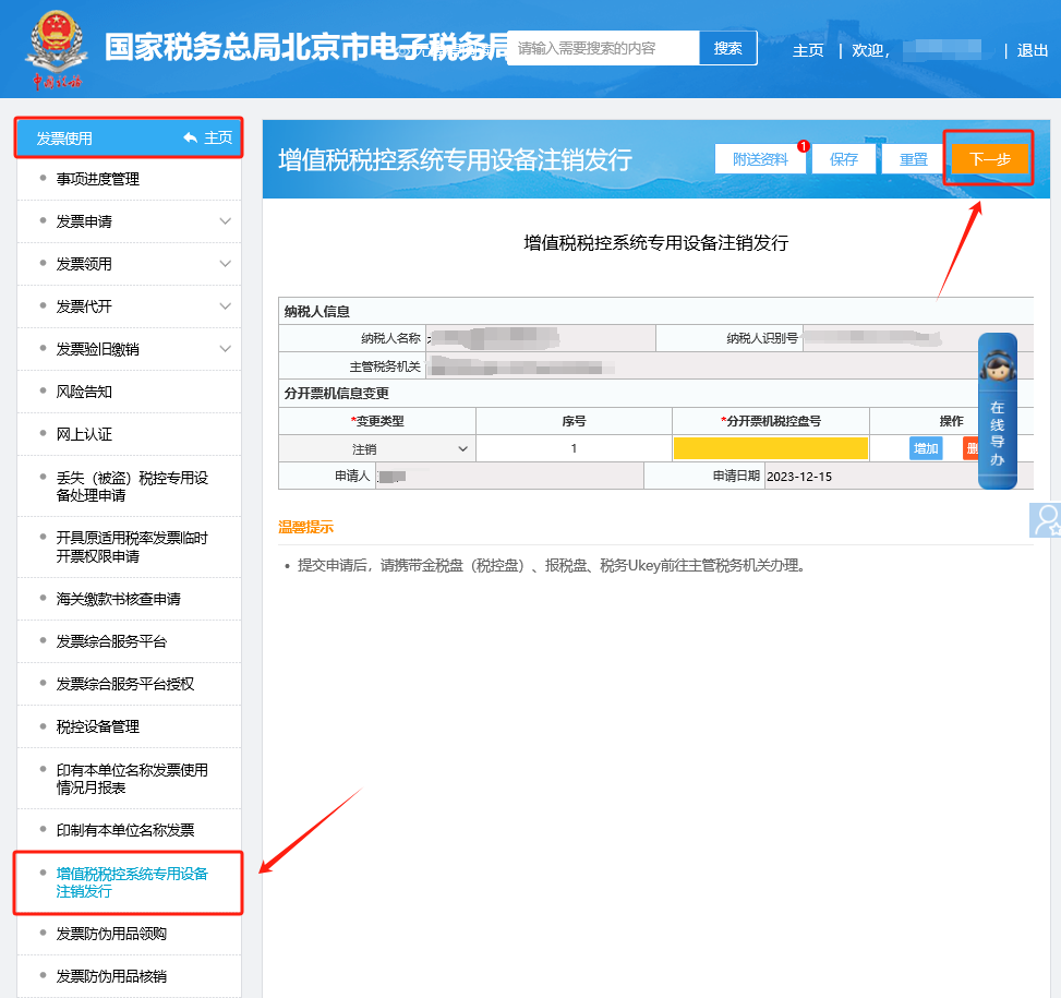 二、發(fā)票使用—增值稅稅控系統(tǒng)專用設(shè)備注銷發(fā)行,進入即可展現(xiàn)填寫界面,請根據(jù)頁面信息填寫完畢并上傳附送資料信息,點擊下一步提交。